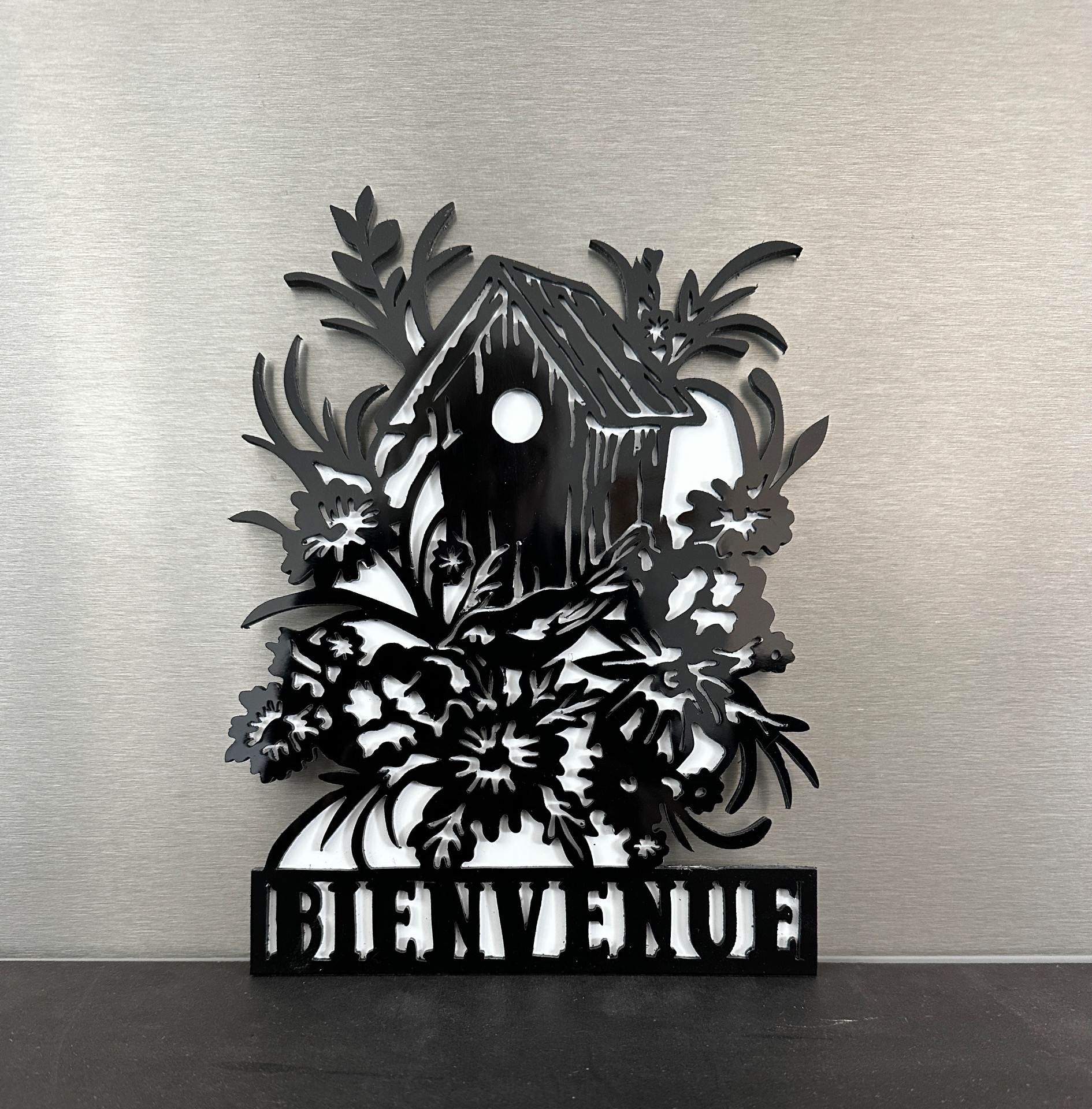 Plaque « BIENVENUE » avec cabane à oiseaux et feuillage (noire sur fond blanc)